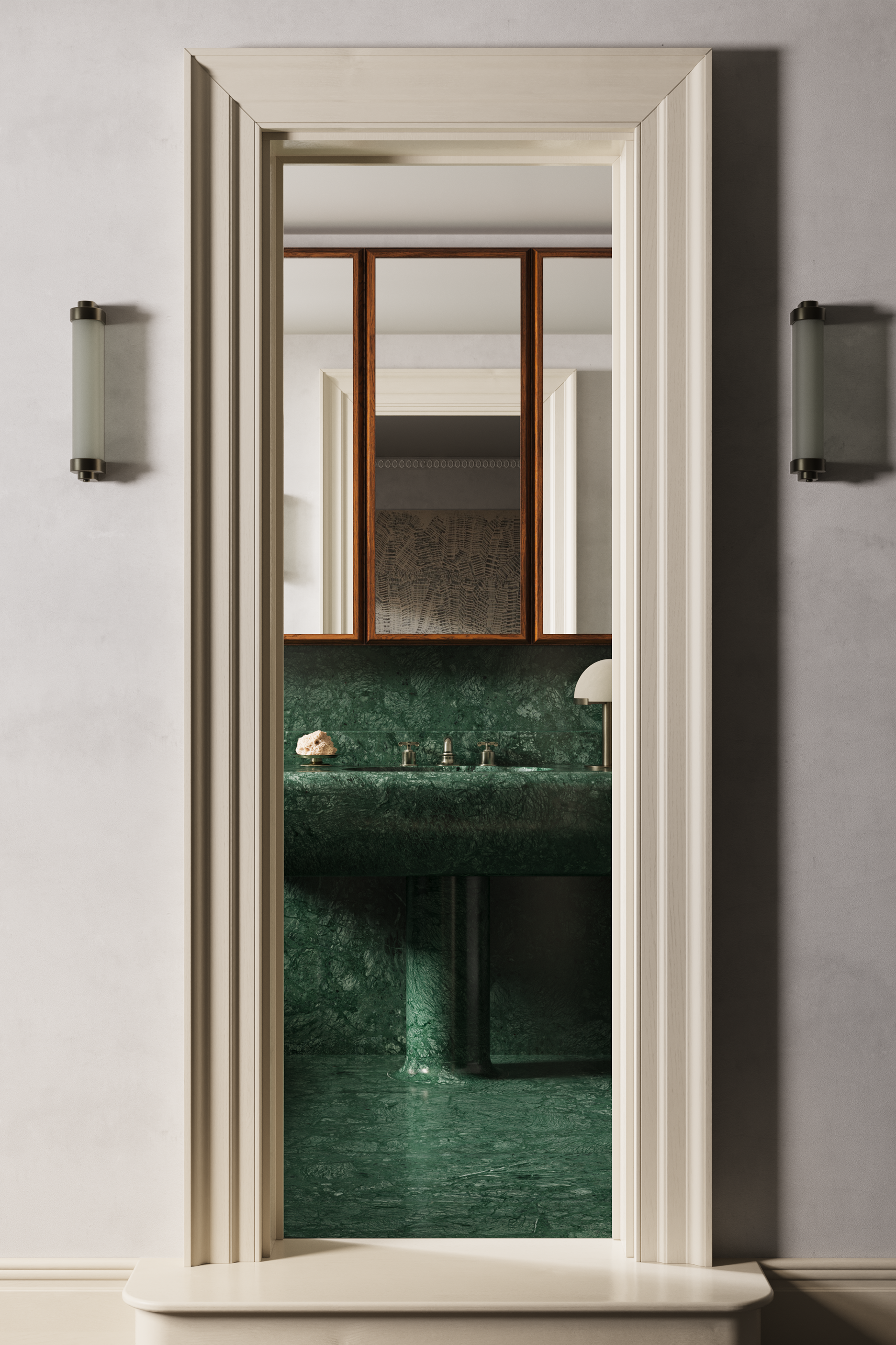 Finally, we manually added imperfections to the unique geometry. For example, the painted door frame was developed with layered lacquer and subtle signs of aging. These details enhance the realism of the visualizations and bring depth and character to the interior.