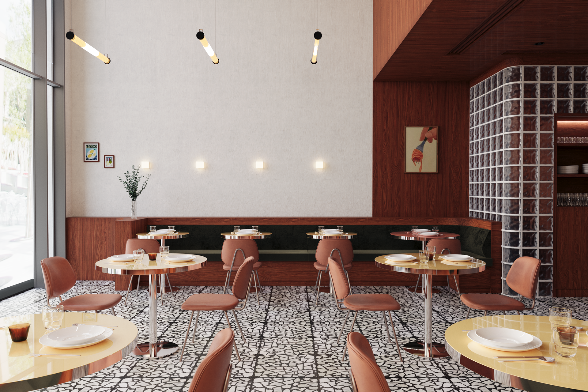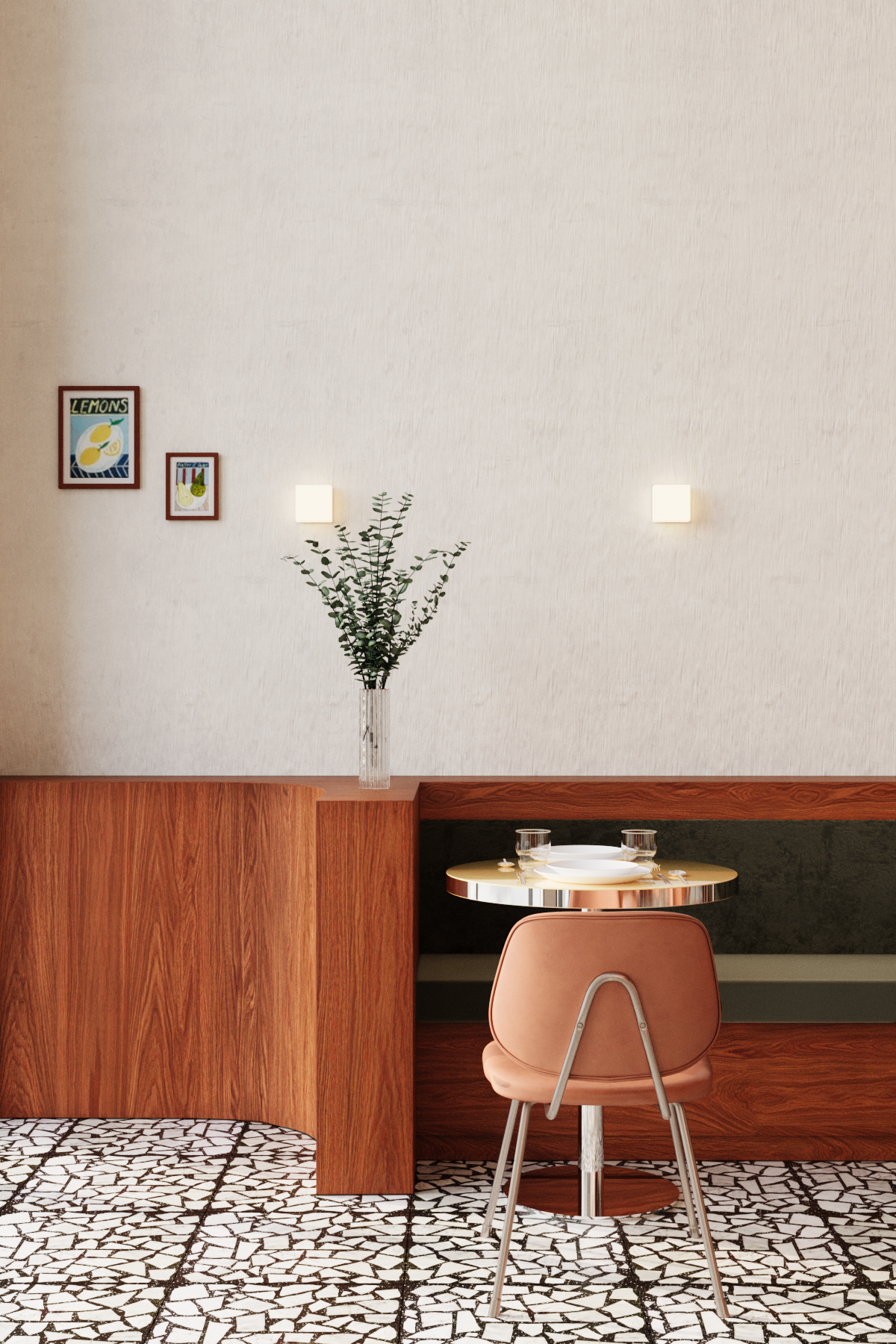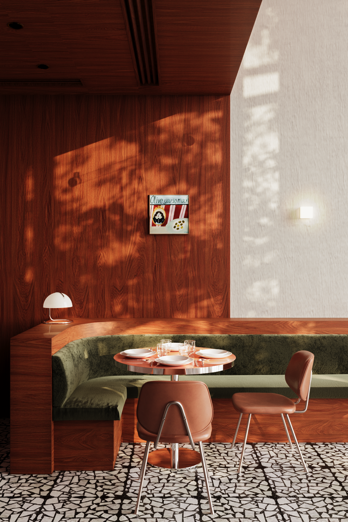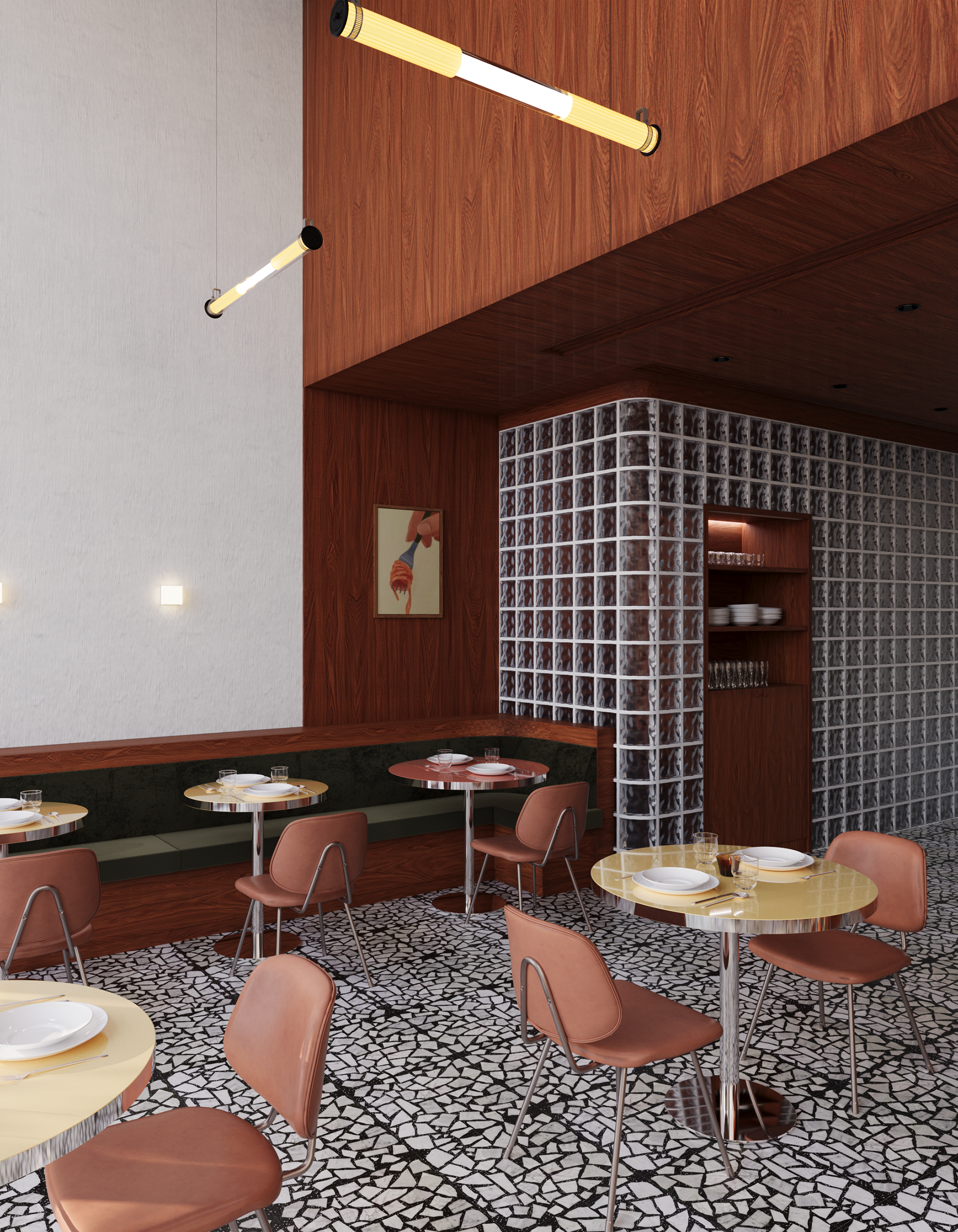 These visualizations were created based on an interior design project by Rawan Muqaddas and Selma Akkari in Doha, Qatar. I chose this reference because I truly admire the masterful combination of clean lines, a modern aesthetic, and the warm, inviting atmosphere of the restaurant.